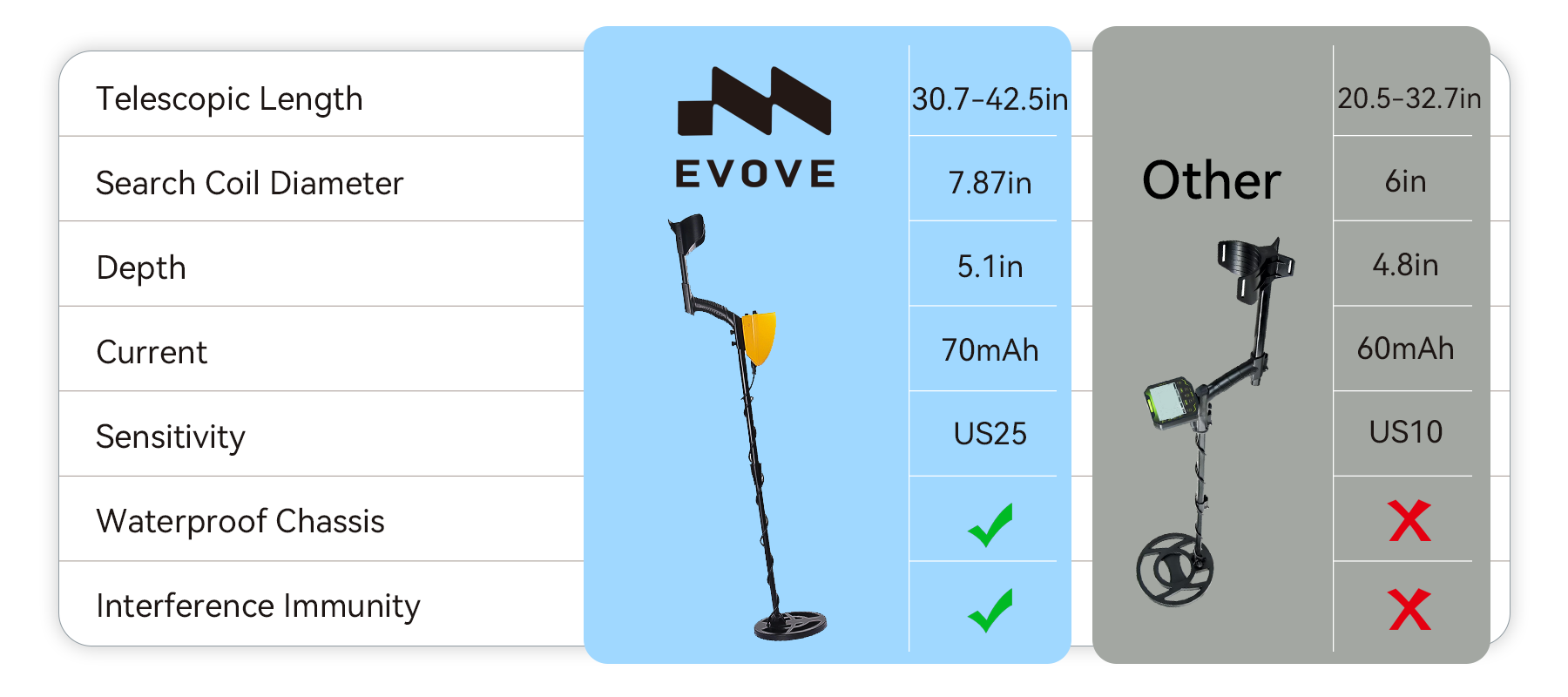 The Evove visual interface is designed for you. A clear meter and pointer, paired with the audio mode, let you quickly and accurately pinpoint targets without memorizing complex numbers. Both beginners and veterans will enjoy an easy yet precise detecting experience.